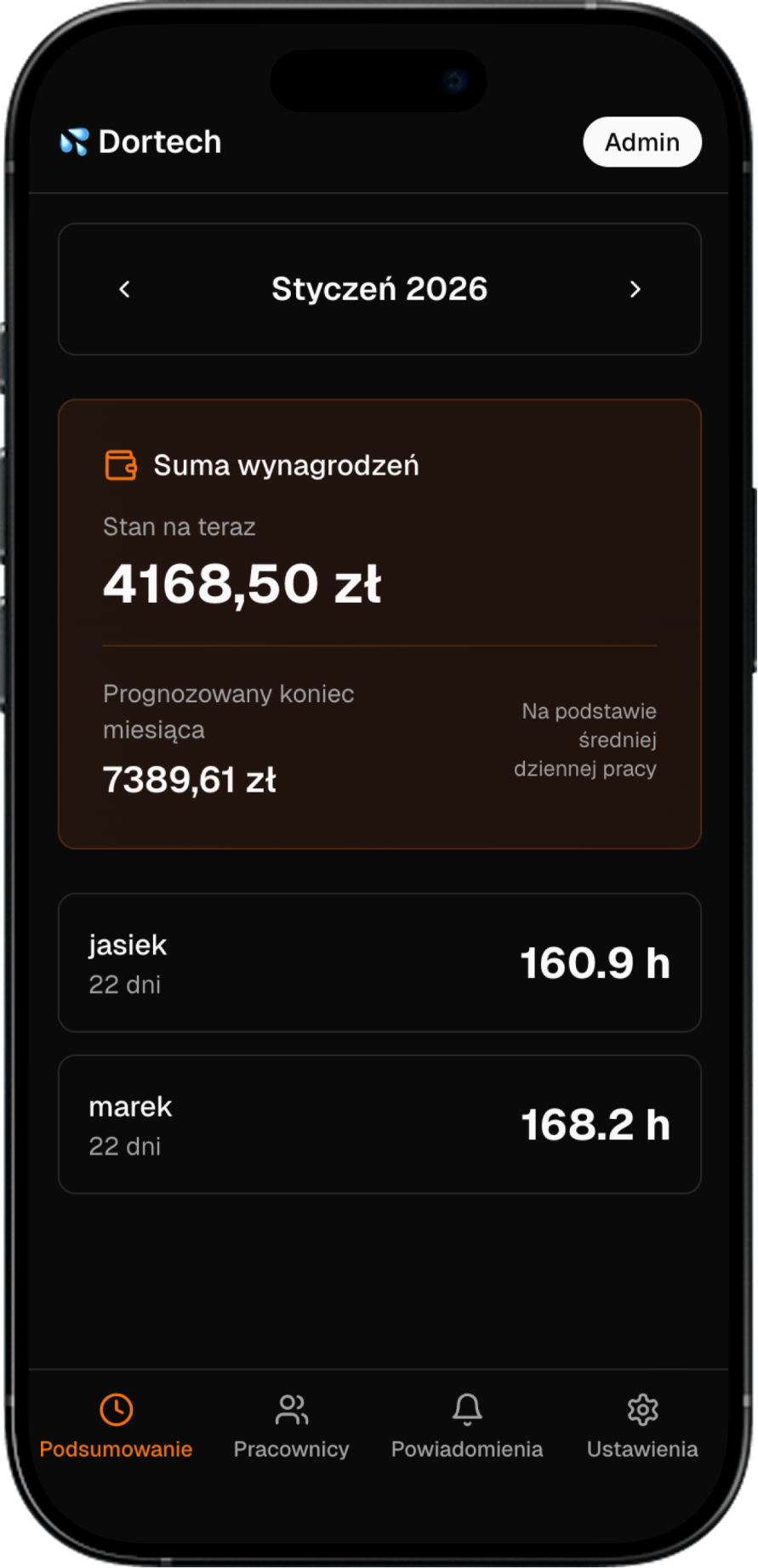 Pracownicy mogą natychmiast rejestrować swoje godziny pracy, a Ty możesz monitorować, zarządzać i analizować wszystkie dane w jednym, centralnym miejscu.
